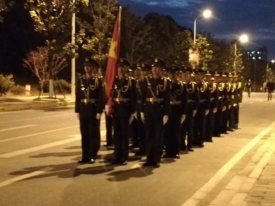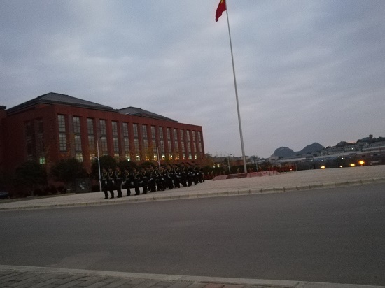 6:40國旗護衛(wèi)隊整隊完畢,護送五星紅旗入場。7:00,隨著“奏中華人民共和國國歌,升中華人民共和國國旗”的口令,旗手出旗、升旗,五星紅旗在空中迎風飄揚。全體師生行注目禮,奏唱國歌,表達對祖國的崇高敬意。