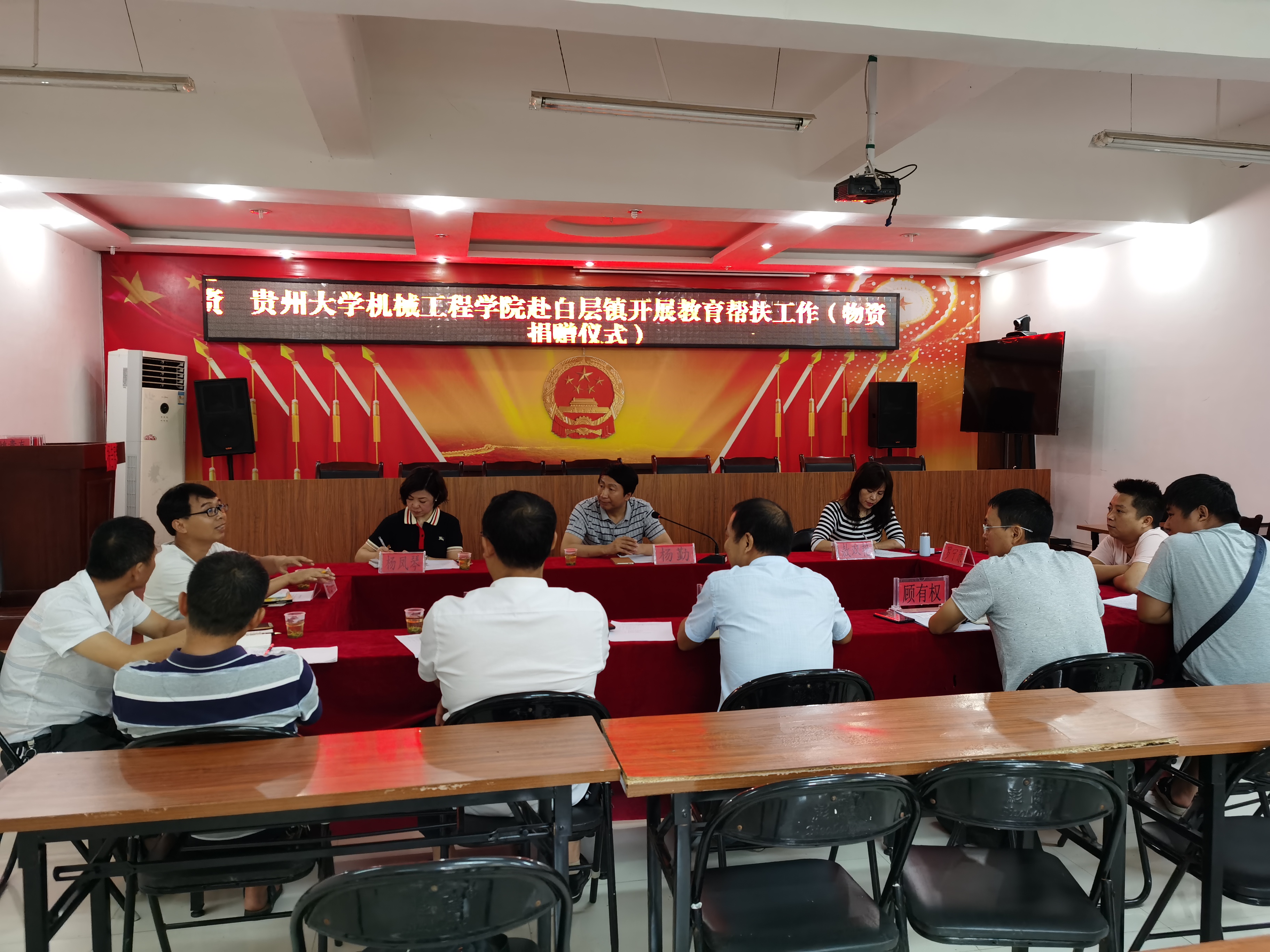 為認(rèn)真落實(shí)《中共貴州大學(xué)委員會(huì)助力脫貧攻堅(jiān)“一院一品”行動(dòng)計(jì)劃實(shí)施方案》,2020年7月2日,機(jī)械工程學(xué)院副院長(zhǎng)楊勤,辦公室主任敖雙艷,音樂(lè)學(xué)院辦公室主任楊風(fēng)琴等攜國(guó)藥集團(tuán)同濟(jì)堂(貴州)公司姜志海赴貴州省貞豐縣白層鎮(zhèn)開(kāi)展教育幫扶工作接洽暨物資捐贈(zèng)儀式,就助力脫貧攻堅(jiān)開(kāi)展工作接洽。貞豐縣白層鎮(zhèn)人大主席劉官浩、黨委副書(shū)記左德健、組織委員顧有權(quán)等鎮(zhèn)領(lǐng)導(dǎo)與兩個(gè)學(xué)院一行人進(jìn)行了座談。