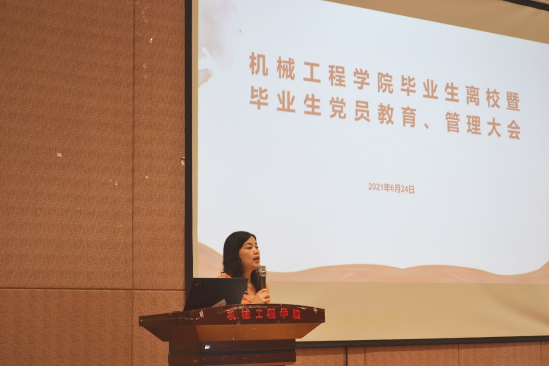 機(jī)械工程網(wǎng)站訊(記者 張江平|攝影 王若男)為扎實(shí)做好機(jī)械工程學(xué)院2021屆畢業(yè)生離校有關(guān)工作,加強(qiáng)對(duì)畢業(yè)生黨員的教育管理,機(jī)械工程學(xué)院于6月24日在機(jī)械樓圓形報(bào)告廳召開(kāi)畢業(yè)生離校暨畢業(yè)生黨員教育管理大會(huì)。學(xué)院黨委副書(shū)記廖燁出席會(huì)議,學(xué)生科岑曉潔、何琳煜、王嘉斌老師及研究生科趙麗芳老師和全體畢業(yè)生參加會(huì)議。會(huì)議由趙麗芳主持。
