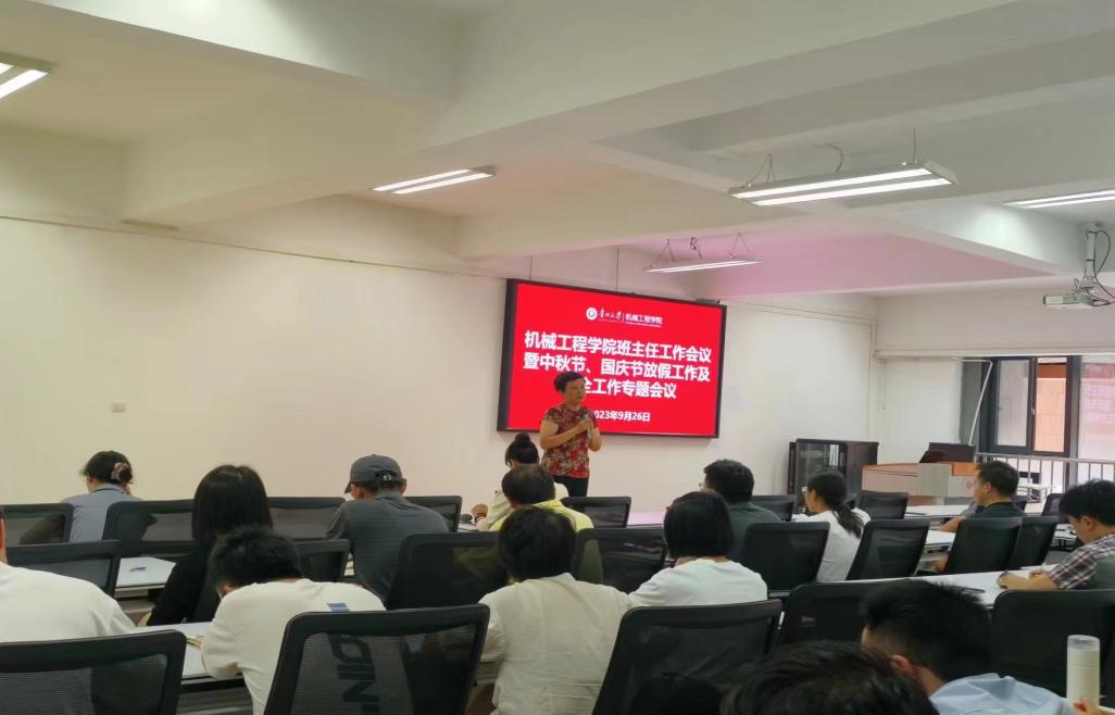 為切實(shí)加強(qiáng)班主任隊(duì)伍建設(shè),做好中秋節(jié)、國(guó)慶節(jié)學(xué)生安全教育管理工作,2023年9月26日,機(jī)械工程學(xué)院在327召開班主任工作會(huì)議暨中秋、國(guó)慶節(jié)前安全工作專題會(huì)議。學(xué)院正處級(jí)組織員董蔚然、黨委副書記廖燁出席,全體班主任老師以及學(xué)生科輔導(dǎo)員共計(jì)50余人參加會(huì)議。