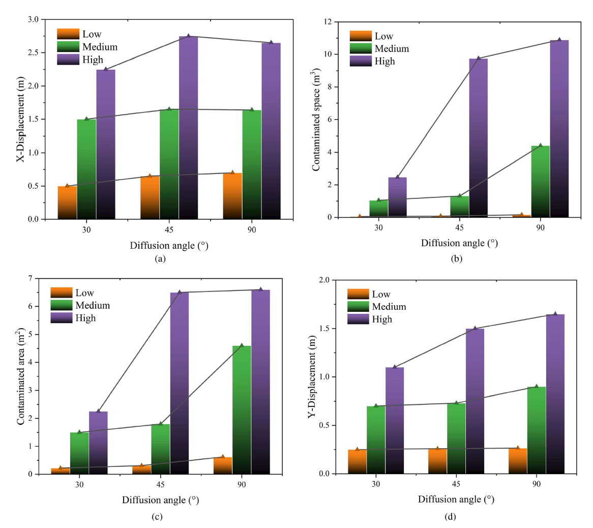 圖 15. 超聲波除垢儀的三種工作條件和三種初始擴(kuò)散角的不同組合對(duì)手術(shù)過(guò)程中大液滴顆粒的空間流動(dòng)特性的影響粒子的空間流動(dòng)特性的影響。(a) 飛濺距離的變化 (b) 污染空間的變化 (c) 飛濺沉積面積的變化 (d) 飛濺高度的變化。