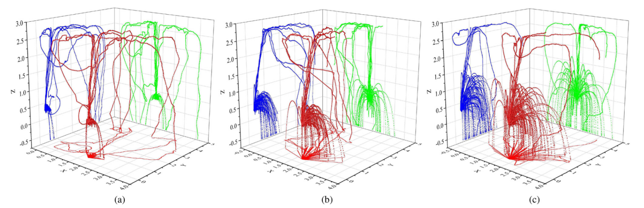 圖 4. 案例 7-9 分別模擬了在大初始噴射角下使用低、中、高功率引發(fā)的液滴流動(dòng)。(a) 液滴的初始噴射速度為 2 米/秒、液滴的初始噴射角為 90;(b)液滴的初始噴射速度為 5m/s,液滴的初始噴射角為 90;以及(c)液滴的初始噴射速度為 8m/s,液滴的初始噴射角為 90。液滴的初始噴射角為 90;