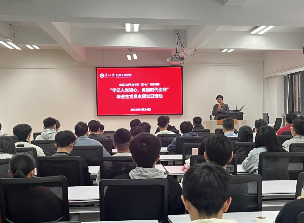 根據(jù)學(xué)院黨委統(tǒng)一安排部署,2024年4月24日學(xué)院研究生科組織即將畢業(yè)研究生黨員開展“重溫習(xí)近平總書記‘五·九’講話精神,牢記入黨初心,勇?lián)鷷r代使命”主題黨日活動,在畢業(yè)研究生黨員中深入開展“畢業(yè)前最后一堂黨課”活動。學(xué)院正處級組織員董蔚然、研究生黨建負(fù)責(zé)人田森老師、研究生兼職輔導(dǎo)員肖祥美老師、機(jī)械工程學(xué)院和現(xiàn)代制造技術(shù)教育部重點實驗室2024屆全體畢業(yè)研究生黨員參加活動。