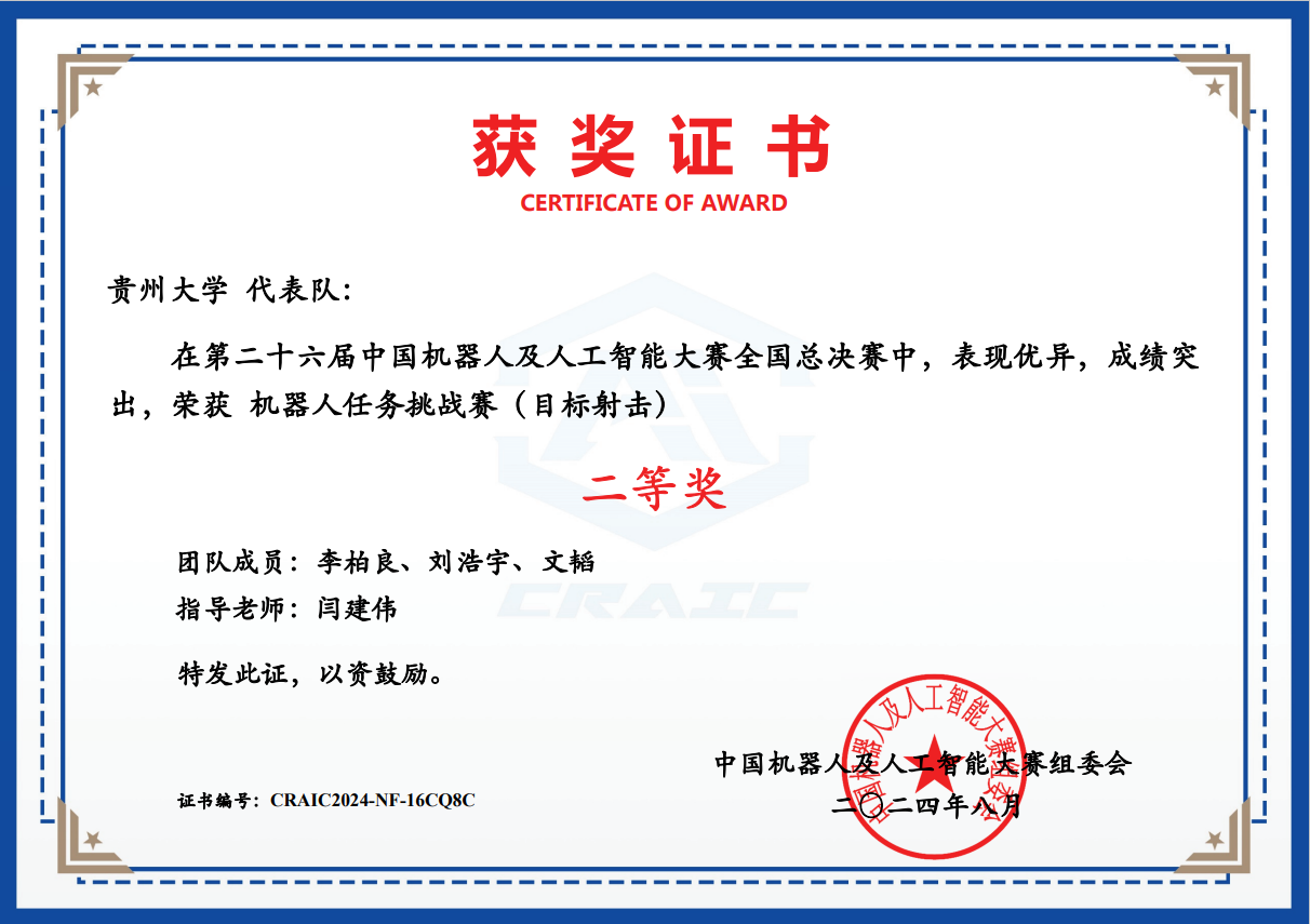 5 | 機(jī)器人任務(wù)挑戰(zhàn)賽(自主巡航) | CRAIC2024U42VLAK5 | 鄒傳筑、趙坤、左康永 | 全國(guó)二等獎(jiǎng) |