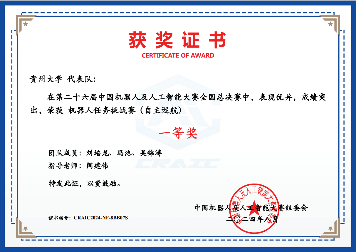 1 | 機(jī)器人任務(wù)挑戰(zhàn)賽(自主巡航) | CRAIC2024YLT12ZKA | 劉培龍、馮池、吳錦濤 | 全國(guó)一等獎(jiǎng) |