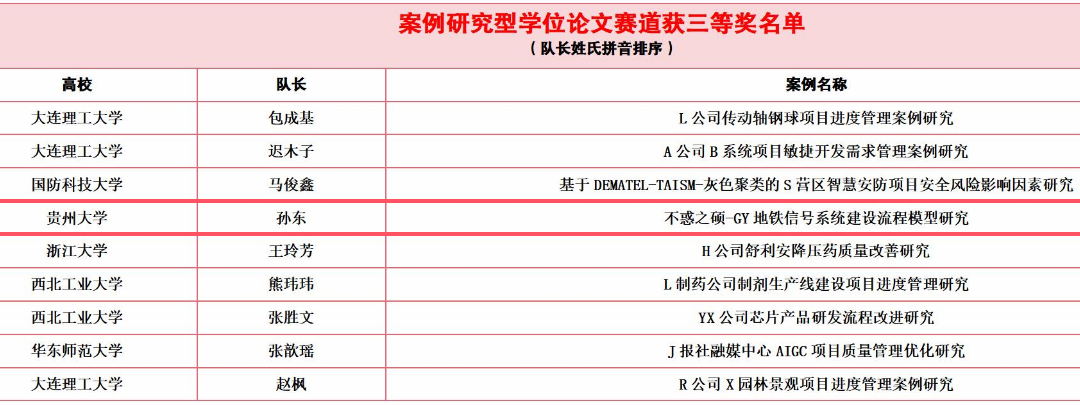 比賽設(shè)六個(gè)平行“主題賽道”。學(xué)院首次嘗試指導(dǎo)工程管理專(zhuān)業(yè)學(xué)生參賽,選擇了“案例研究型學(xué)位論文”賽道。參賽期間我院梅益教授、楊觀賜教授和李少波教授等指導(dǎo)工程管理專(zhuān)業(yè)學(xué)生不斷打磨論文。2021級(jí)工程管理專(zhuān)業(yè)孫東同學(xué)的論文《GY地鐵信號(hào)系統(tǒng)建設(shè)流程模型研究》獲得全國(guó)三等獎(jiǎng),實(shí)現(xiàn)了工程管理重大賽項(xiàng)零的突破。