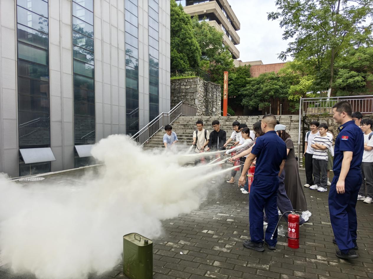 培訓(xùn)現(xiàn)場(chǎng)還組織同學(xué)們開(kāi)展了應(yīng)急演練,通過(guò)以滅火器的使用為例,鞏宇峰、秦榮東演示了滅火器的使用步驟:一看、二提、三拔、四瞄、五壓噴,指導(dǎo)了同學(xué)們使用滅火器撲滅模擬火源,從準(zhǔn)確判斷風(fēng)向、與火源保持安全距離,到拔保險(xiǎn)銷(xiāo)、握住噴管、對(duì)準(zhǔn)火焰根部按壓噴射,同學(xué)們準(zhǔn)確掌握了滅火器的使用方法。