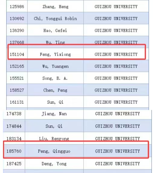 2025年9月19日,美國斯坦福大學(xué)(Stanford University)與愛思唯爾(Elsevier)聯(lián)合發(fā)布了第八版《全球前2%頂尖科學(xué)家榜單2025》(World’s Top 2% Scientists 2025)。該榜單依托Scopus數(shù)據(jù)庫的引用數(shù)據(jù)進(jìn)行系統(tǒng)分析,從全球近700萬名科學(xué)家中,依據(jù)“生涯影響力”和“年度影響力”兩項(xiàng)指標(biāo),遴選出世界排名前2%的頂尖科學(xué)家。其中,中國有12374位學(xué)者入選“終身榜”,31685位學(xué)者入選 “2025 年度榜”。我院馮毅雄教授、彭慶國副教授亦榜上有名,成功入選2025年全球前2%頂尖科學(xué)家“年度影響力”榜單,如圖1所示。