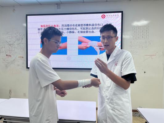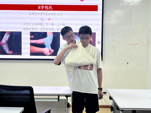 接著,姚云騫老師分享了關于“創(chuàng)傷救護”的急救知識。他普及一個“先救命,后治傷”的救護原則,并現場演示了直接壓迫止血,加壓包扎止血,8字包扎法,三角巾膝關節(jié)帶式包扎,骨折固定等救護方法。
