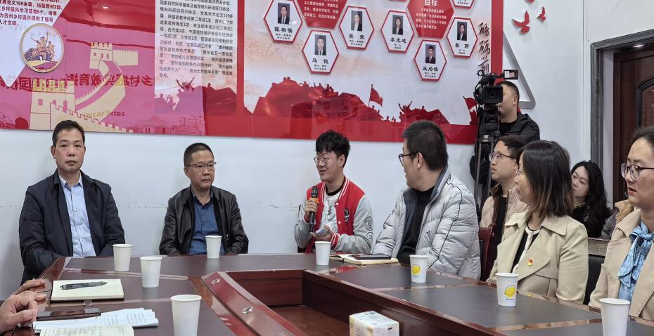 在“聽·一線故事”環(huán)節(jié),全體人員移步至農(nóng)場會(huì)議室。大家首先觀看了“全國模范教師”、機(jī)械工程學(xué)院張富貴教授的紀(jì)錄片《田間富貴》,并聆聽了張老師結(jié)合親身經(jīng)歷,講述如何將教育力量轉(zhuǎn)化為鄉(xiāng)村振興動(dòng)能的感人故事;隨后,全國先進(jìn)工作者、貴州大學(xué)教學(xué)實(shí)驗(yàn)農(nóng)場副場長龍友華教授分享了自己如何通過科普活動(dòng)和科技培訓(xùn),幫助村民了解新技術(shù)、掌握新技能,讓科技真正成為推動(dòng)鄉(xiāng)村進(jìn)步的強(qiáng)大引擎。隨后的“1+3”圓桌對談中,學(xué)生黨員聚焦“傳承與成長”、駐村隊(duì)員聚焦“實(shí)踐與賦能”、管理崗教師聚焦“協(xié)同與保障”,與張老師和龍老師展開了深入的思想碰撞與交流。